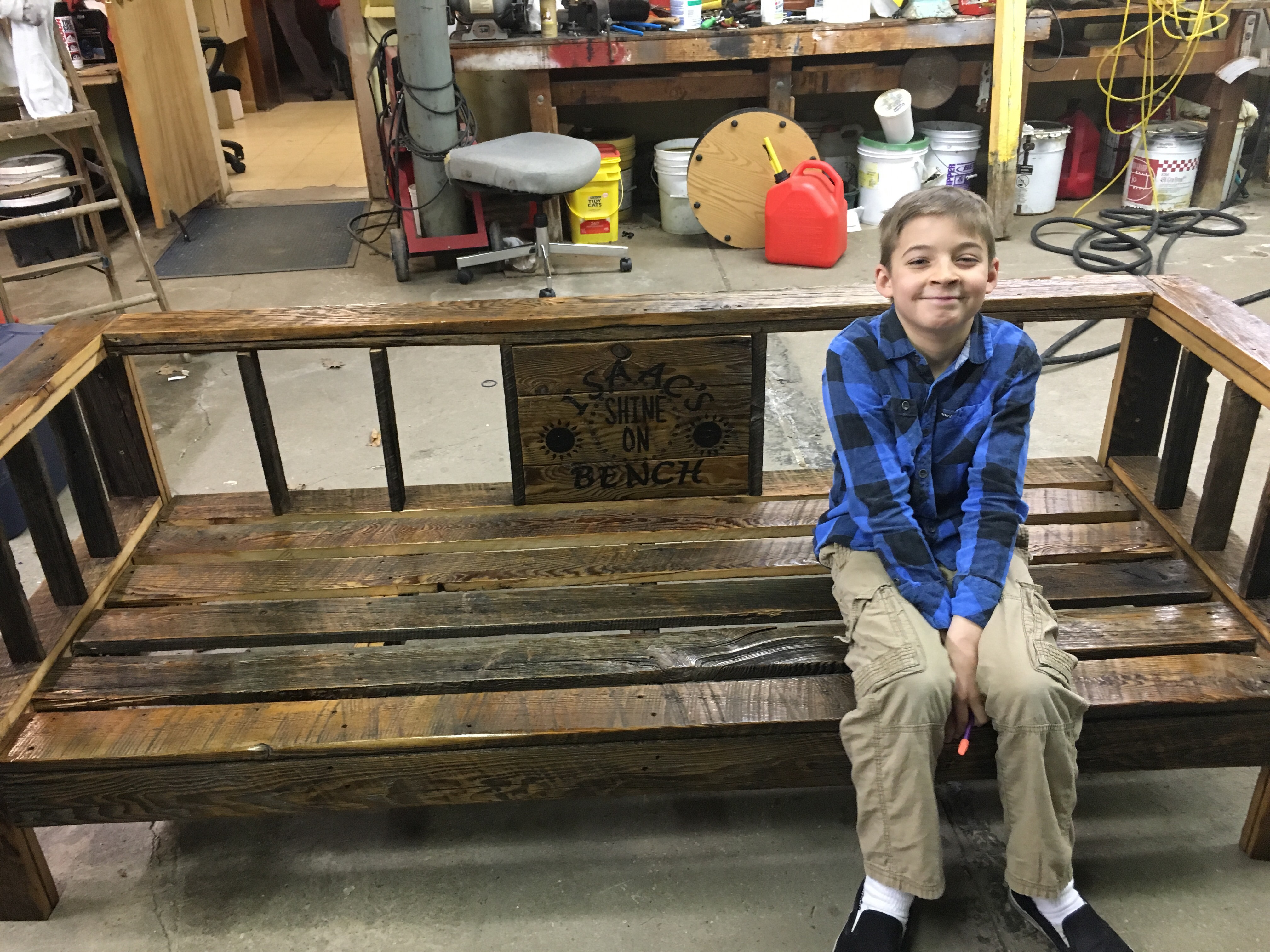 Isaac’s cousin, Jackson, my sweet nephew was invited to participate in creating a presentation to coincide with learning about power point media. His teacher and the teacher who’s idea this was invited me into the classroom today to watch the entire class role play how to use the bench. And then we got to go visit the bench, made by another teachers husband who happened to be one of Isaac’s favorite coaches. I had been sent a photo of the bench– or so i thought! What I have since learned is that I saw a mere thumbnail photo of the sign with Isaac’s name in it. The bench is an utterly beautiful work of craftsmanship and love.